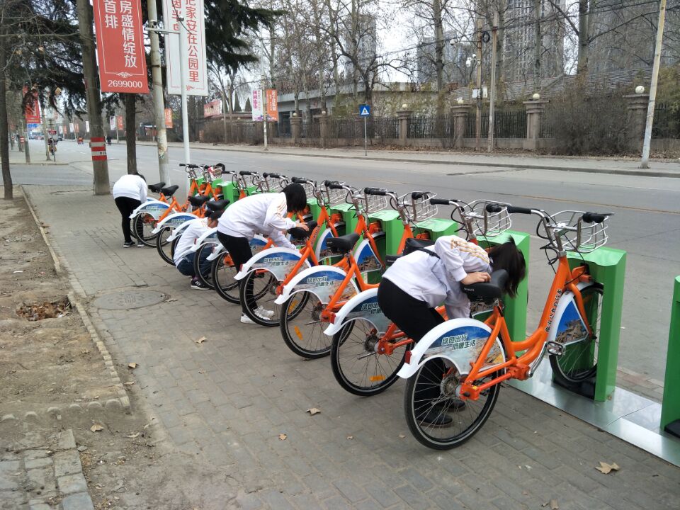 等4处站点的公交自行车、驻锁以及停靠设施进行了全面的清洁。志愿者们带着毛巾和水等清洁工具,在不影响市民租赁的情况下,对自行车进行仔细清洗。大家相互合作,合理分工,积极配合,从车把手到坐垫,从车身到车轮,从自行车到锁桩,同学们用心擦洗,不放过任何一个卫生死角。寒风凛冽中,志愿者们毫不退缩,积极热情地投入到清洁工作中,现场忙碌不已。经过一下午的努力,公共自行车站点的公共自行车焕然一新。同学们的工作不仅是让周边的公共自行车变得洁净,更向社会传达一种正能量:爱护公物,奉献社会,是每一个公民应尽的义务。