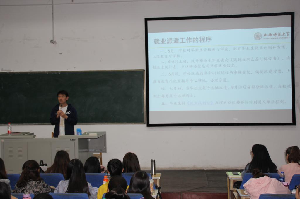 在05203教室举办2018届毕业生就业指导会暨4月份年级例会。校就业指导服务中心张大为老师为毕业生做就业指导,院党委副书记杨亚东就4月份重点学生工作进行了安排。2014级全体同学参加会议,会议由杨亚东主持。