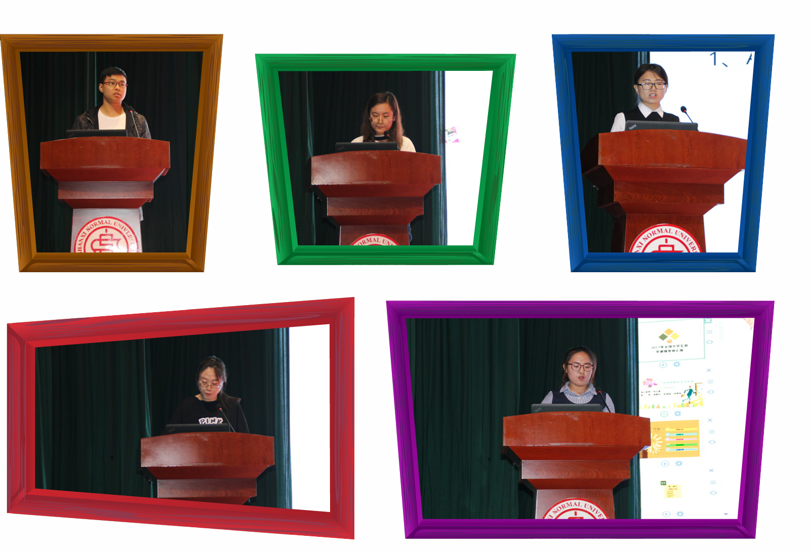 本次实践教学展是由五大赛事获奖的学生代表进行经验分享。成丽花和杨笑同学分别代表2017年全国大学生数学建模竞赛二等奖和亚太地区大学生数学建模竞赛二等奖的获奖团队发言。她们简要介绍了国赛和亚太赛的概况和区别,从前期准备、赛前培训、参赛过程、注意事项和赛后体会几个方面进行了详实的汇报,建议大家要熟练掌握matlab、合理分配时间并明确好团队分工,强调了具备扎实的数据检索和论文写作能力的重要性。之后指导老师周正勇系统地介绍了各类建模比赛的内容,并表示数学建模竞赛题目紧扣时代脉搏,贴近工程和生活实际,参加建模比赛是对参赛队伍团队精神、专业能力和综合素质的全面考察。荣获全国大学生“互联网+”创新创业大赛一等奖的团队代表刘新远同学介绍了比赛性质和意义,展示了项目作品和路演ppt,分享了参赛经历和经验。他谈到好的创意必须同时具备新颖性、可行性和商业性,而组建团队、创业原点和商业模式是参赛的关键。指导老师刘生芝评价该项目选材创意新颖且内涵丰富,深受比赛评委的青睐。荣获全国移动互联创新大赛三等奖的团队代表王晨晖讲述了自己的“参赛日记”,现场展示了z-ing团队制作的“火车报站”app,结合四年学习计算机专业知识的感悟和参赛以来的心路历程交流了自己的所思所悟。作为第五届全国师范院校师范生教学技能竞赛的三等奖获得者,郝燕同学谈到此项比赛重点考察的是学生的教案书写、ppt制作和授课等能力,就如何备战提出了具体的建议。指导老师刘生芝表示,教师技能大赛对普通话、三笔字和教学技能都有严格的要求,参加这样的比赛对师范生未来应聘试讲很有帮助。