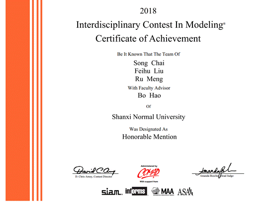 近日,2018年美国大学生数学建模竞赛(MCM/ICM)成绩揭晓,我院学生首次参赛取得了优异成绩,荣获二等奖1项,三等奖6项。