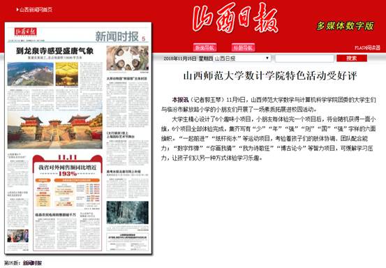 为了发扬共青团“全团带队”的优良传统,提高小学生心理素质和综合能力,同时增强青马学员的教学技能和实践能力,11月9日下午,我院学生与临汾市解放路小学的小朋友们开展了一场素质拓展进校园活动。此次特色活动受到好评,被山西日报和山西新闻网报道。