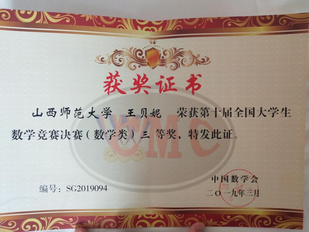 2019年3月29-31日,第十届全国大学生数学竞赛决赛在哈尔滨工业大学举行,我院学生王贝妮在决赛中表现优秀,喜获数学组三等奖。
