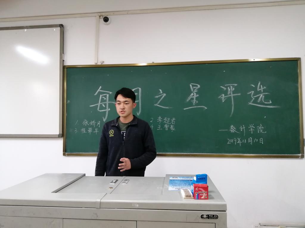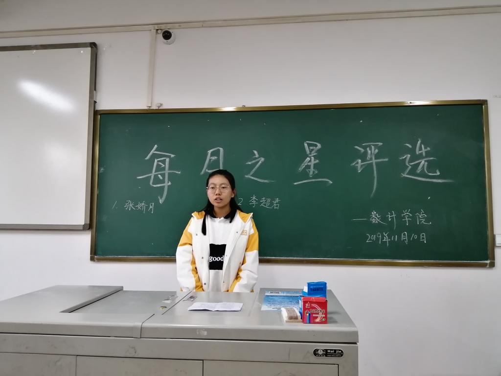 团委学生会十月份的“每月之星”。最后,学生会主席赵佳进行总结发言,对近期各部门有序推进各项工作提出了表扬,同时强调学生会与各班级之间应共谋发展思路,鼓励各班同学对学生会工作提出宝贵建议。