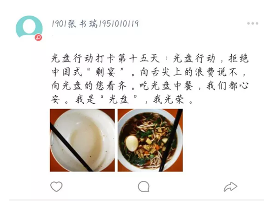 在活动中每位同学每餐需要上传餐前食物图及餐后光盘图,规定在14天的时间里,每天在打卡圈打卡一次即可成功完成光盘行动。活动期间,同学们坚持每日打卡,使光盘成为一种生活习惯。节约每一粒粮食的理念深入同学们的心中。