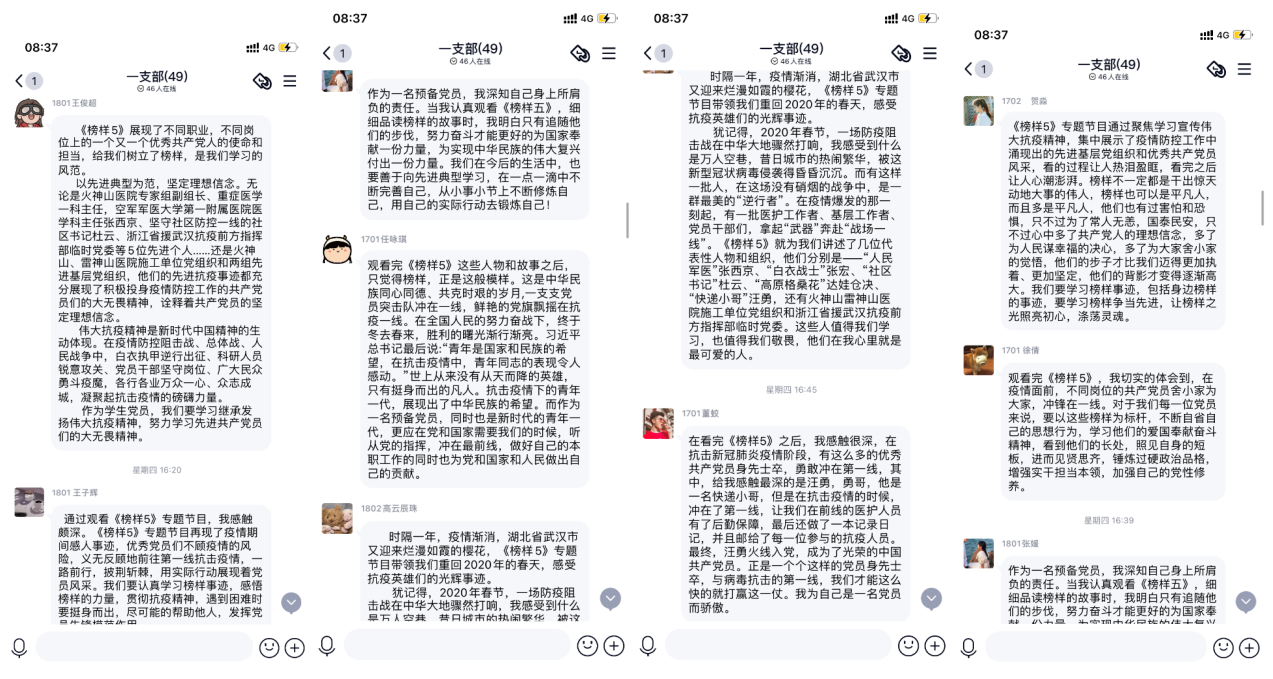 教工党支部的老师们通过收看节目,对抗疫期间奋斗在第一线的医务工作者们,以及在背后默默付出的人们,纷纷表示由衷的敬佩和赞叹,大家一致认为在今后的工作中,将始终牢记教书育人使命,增强“四个意识”、坚定“四个自信”、做到“两个维护”,要坚持以学生为中心的发展思想,以教学改革为主线,不断提高教学水平,创新教学方式方法,提升教学质量,培养更多具备综合能力的时代新人,为全面建设社会主义现代化国家新征程开启之年做出自己的贡献,以优异成绩迎接建党100周年。