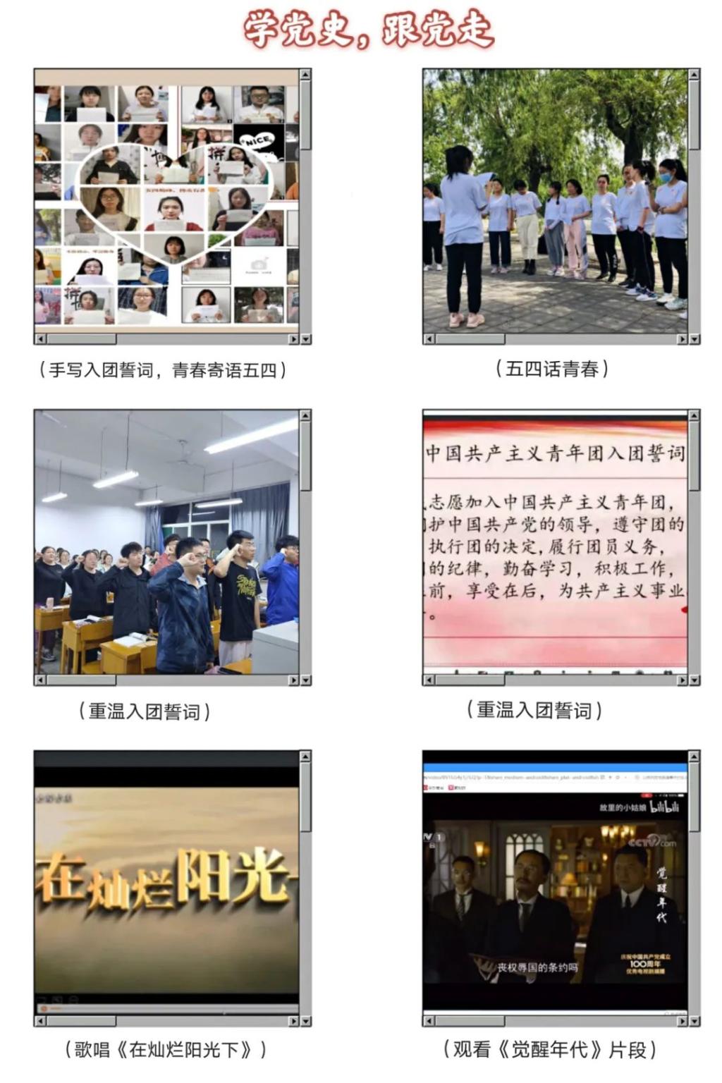 团委组织各团支部开展了形式多样的“弘扬五四精神,学党史跟党走”主题团日活动,教育引导青年学生学习党的光辉历史、传承和弘扬“五四”爱国精神,激励广大青年学生坚定理想信念。各团支部通过重温入团仪式、观看《觉醒时代》节选片段、朗诵《少年中国说》、歌唱《在灿烂阳光下》等方式,深入地学习了五四时期的历史,了解了五四精神的内涵。各支部团员积极参与了“五四话青春”活动,壮烈的英雄事迹深深地鼓舞了他们,他们纷纷表示要继承和发扬先辈们英勇无畏、迎难而上的精神,努力为中华民族伟大复兴做出自己的贡献。