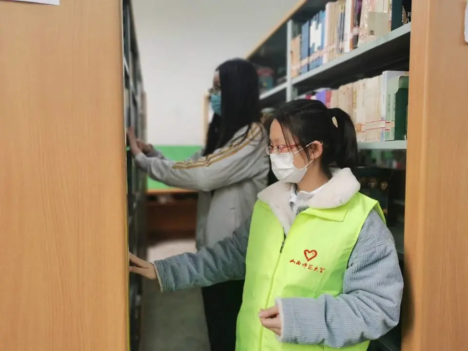 在图书管理员老师的指导下,志愿者们满怀热情地投入到劳动服务中去。他们将图书有序摆正,整理好杂乱的图书,使得书架更加有序美观。各位志愿者分工明确、配合默契、井然有序,十分认真,阅览室里随处可见他们忙碌的身影。