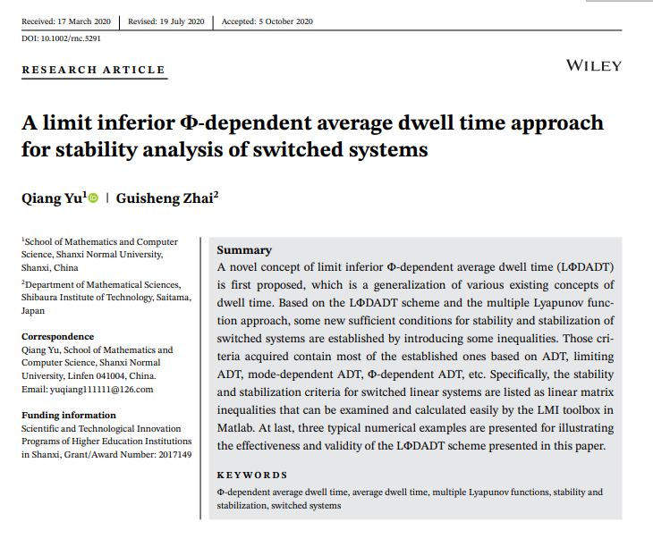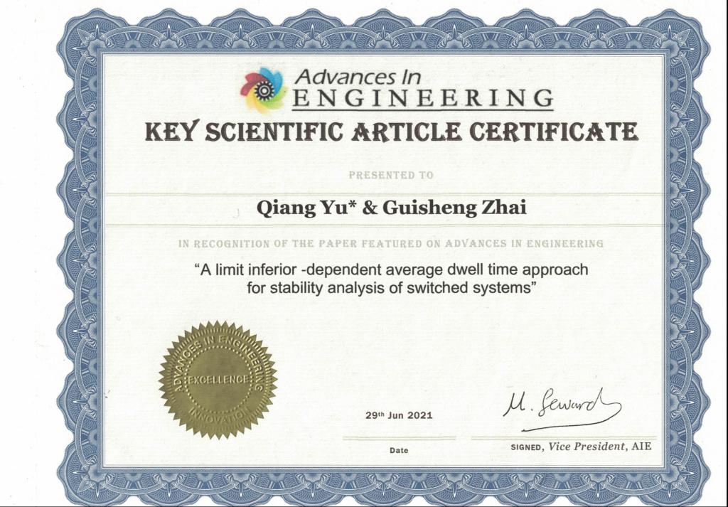 玉强副教授在控制领域著名Top期刊International Journal of Robust and Nonlinear Control上发表的论文“A limit inferiorΦ-dependentaveragedwell time approach for stability analysis of switched systems”被国际著名工程科技新闻网站Advances In Engineering(AIE)评选为工程科技领域的“Key Scientific Article(关键科学论文)”,并在general Engineering栏目予以专题报道。玉强副教授为该论文的第一作者兼通讯作者,日本芝浦工业大学的翟贵生教授为该文另一合作者。