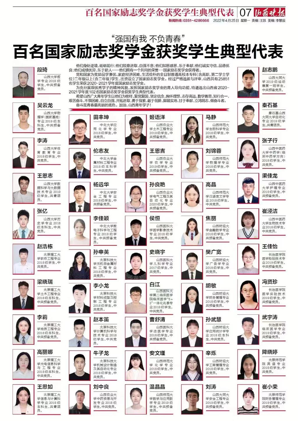 4月25日,《山西晚报》刊登了《“强国有我、不负青春”百名国家励志奖学金获奖学生典型代表》,我院学子温晶晶成功入选。