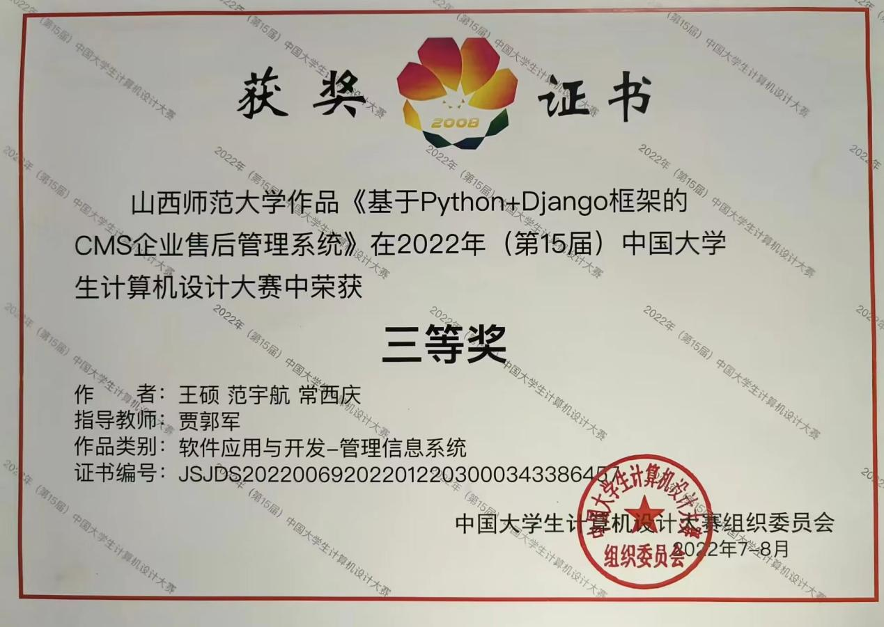 参赛队伍的软件开发与应用组作品《基于Python+Django框架的CMS企业售后管理系统》荣获山西赛区二等奖、全国三等奖。
