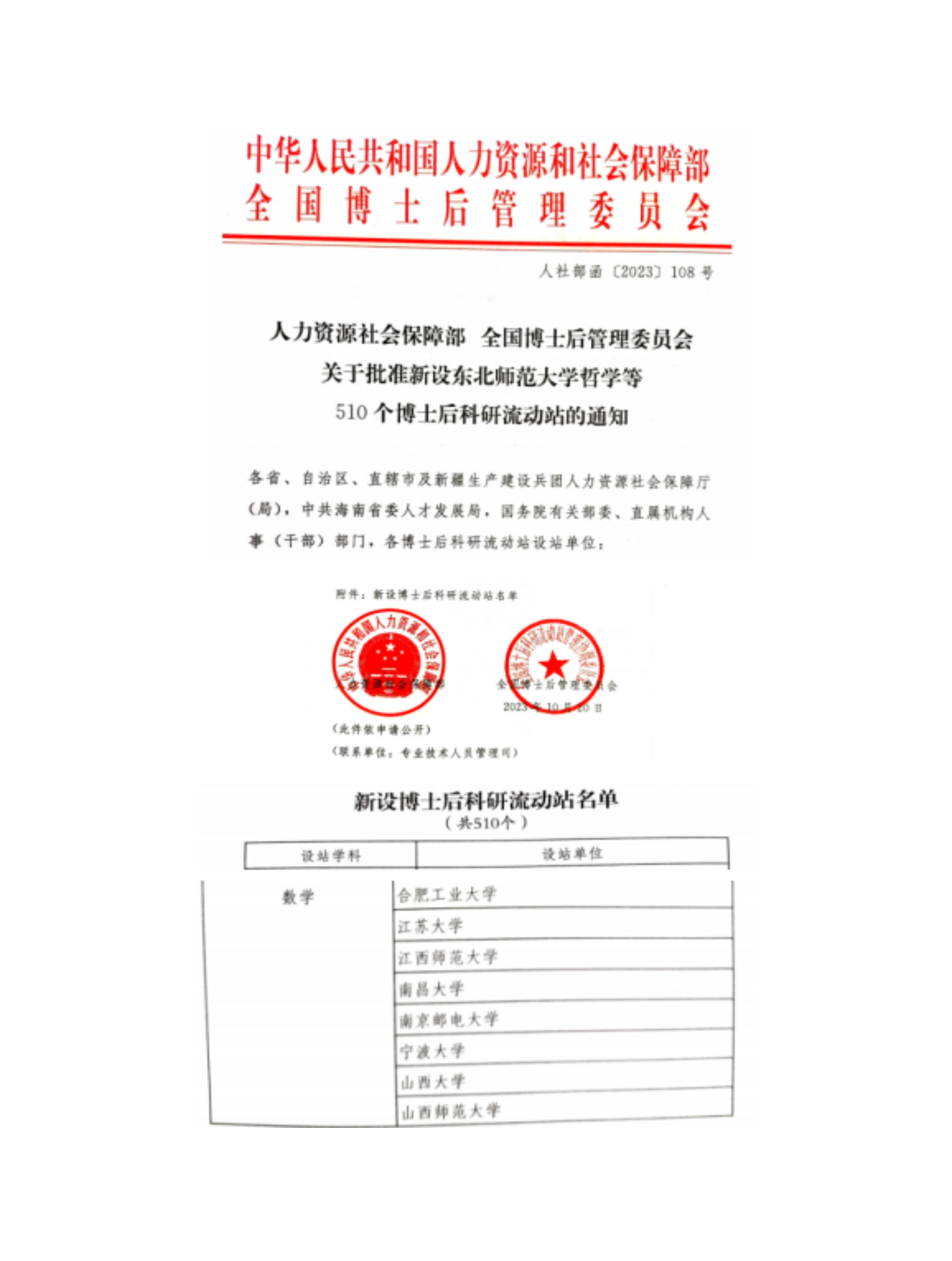 近日,人力资源和社会保障部、全国博士后管理委员会发布了《关于批准新设东北师范大学哲学等510个博士后科研流动站的通知》,我校数学博士后科研流动站成功获批,这是我校继戏剧与影视学、化学博士后流动站后,获批的第三个博士后科研流动站。