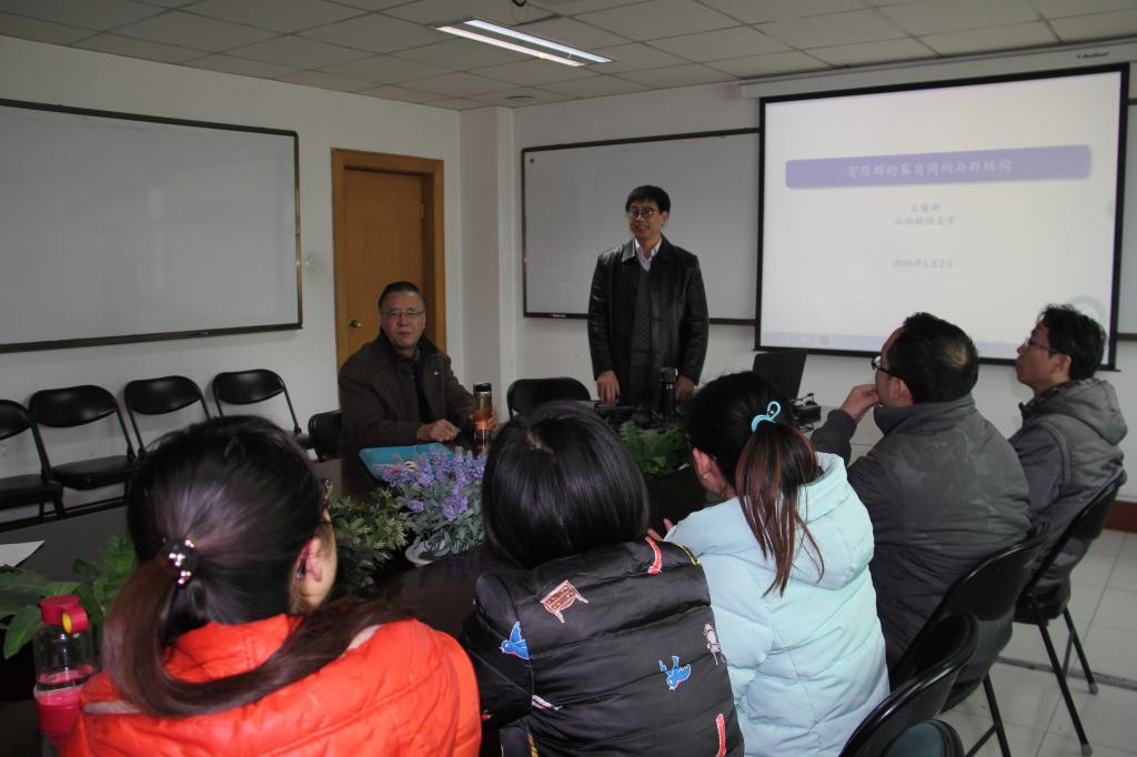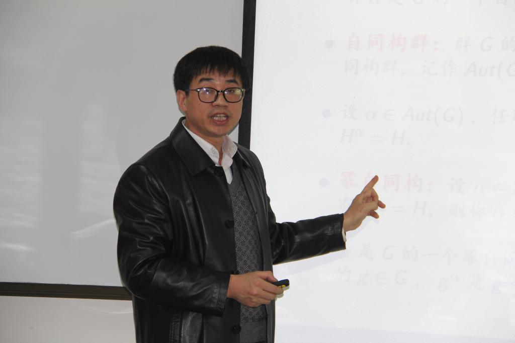 2016年1月2日下午3:00,在山西师范大学科学会堂A座802会议室,来自山西财经大学的王俊新教授做了题为《有限群的幂自同构与群结构》的学术报告。在当天的学术报告上,王俊新教授首先从幂自同构的概念讲起,介绍了自己关于Norm和准无不动点自同构等方面的一些思考,最后介绍了自己在上述方面的多个学术成果。