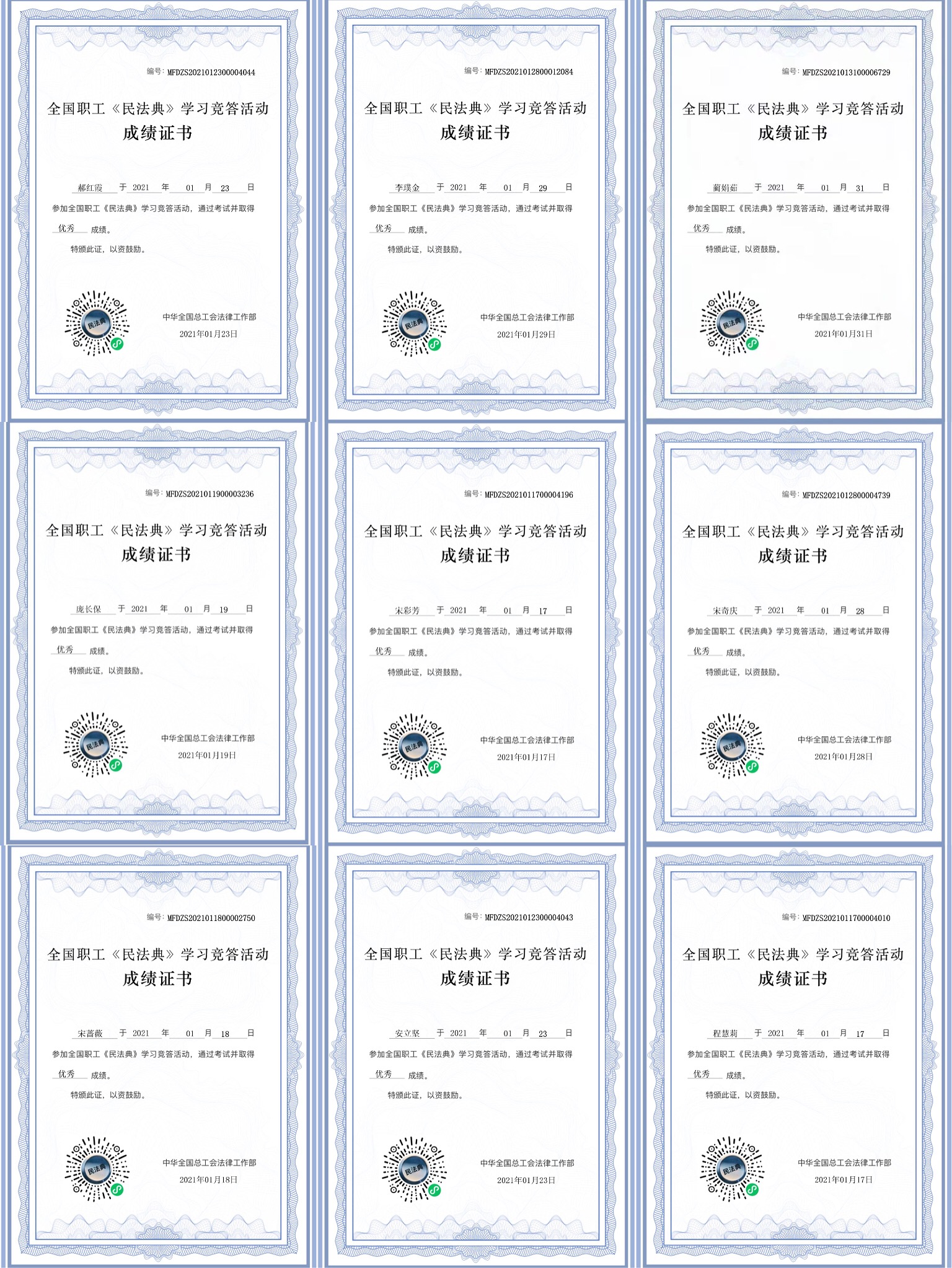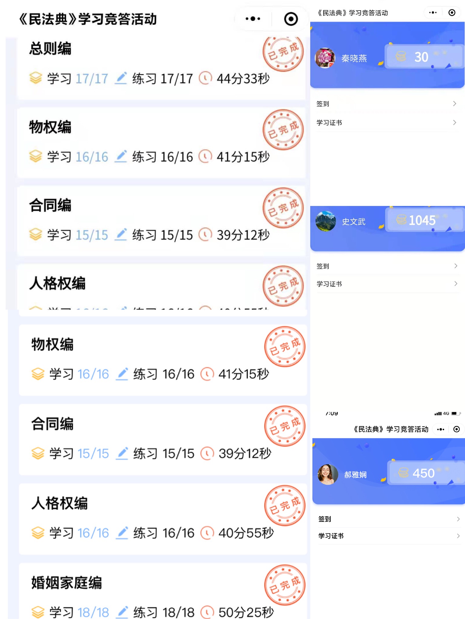 全院102名教师全部参加了学习活动,参与率100%,共有99位老师顺利通过“全国职工《民法典》学习竞答活动”获得了成绩证书,其中有35名老师获得“优秀”,优秀率35.35%。通过学习,我院教职工纷纷表示收获颇多。