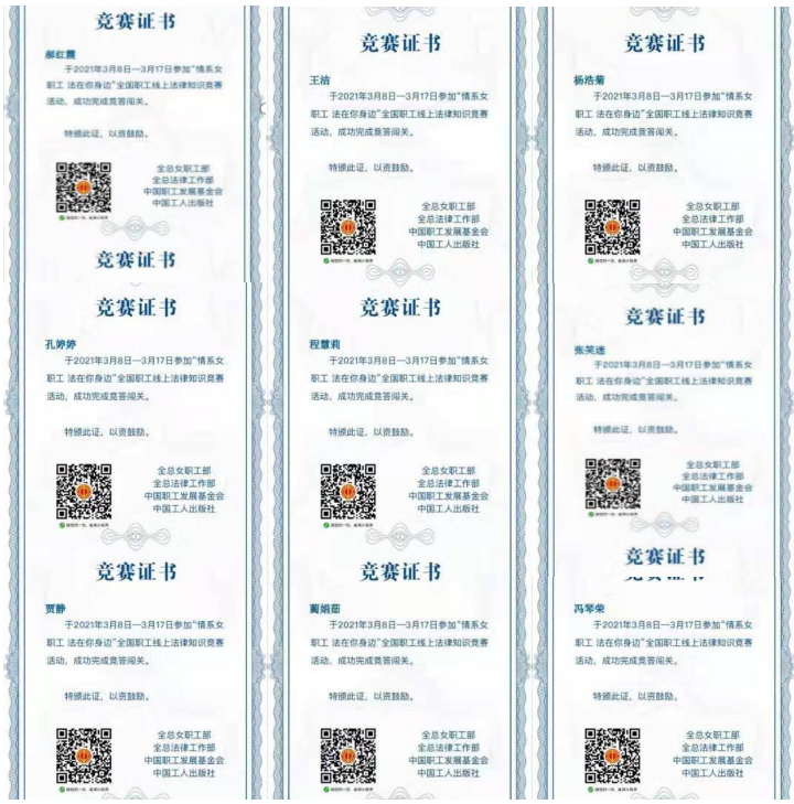 此次活动共持续10天,全院女教职工57人全部参与了活动,参与率100%,其中55位老师顺利通过“情系女职工,法在你身边”线上法律知识竞赛活动,并获得了竞赛证书,通过率高达96.5%。通过观看普法短视频和知识竞答,我院教职工纷纷表示收获颇多。