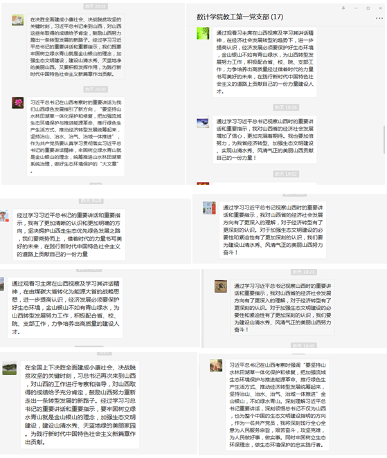 按照777娱乐城 的安排,结合支部实际,我支部进行了“学习习近平视察山西重要讲话精神,做山西腾飞的奋斗者”线上学习交流活动。通过学习,党员们对山西当前和今后一个时期的前进方向有了更明确的认识,一致认为要坚持落实党的教育方针和立德树人根本任务,把党员先锋作用体现和融入到教学科研中,充分发挥“学、带、创”作用,做好学科建设和人才培养工作,在777娱乐城 申报博士点和第五轮学科评估工作中持续发力,为乘势而上书写山西践行新时代中国特色社会主义新篇章作出贡献。