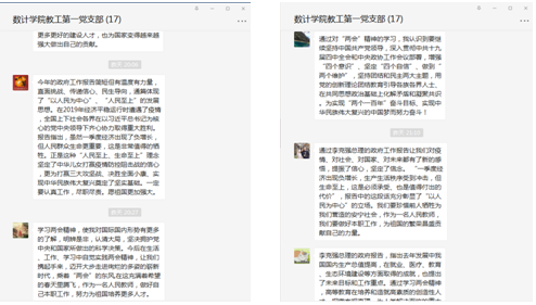 全体党员一起学习了习近平两会期间的重要讲话和李克强总理在2020年5月22日第十三届全国人民代表大会第三次会议上所做的政府工作报告。通过学习,同志们对习近平总书记“以人民为中心”、“人民至上”的发展思想有了更深刻的认识,对社会主义制度的优越性有了更深刻的认识,对我国当前一个阶段的国情和面临的国际形势有了更多的了解,“四个自信”更加坚定了,纷纷表示要在自己的工作岗位上努力工作,以“立德树人”为根本,为培养社会主义建设者和接班人而努力奋斗!