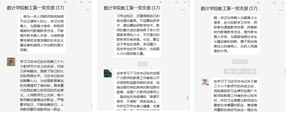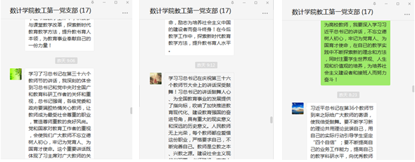 的安排,结合支部实际,我支部组织党员进行了线下自学《习近平谈治国理政》第三卷和习近平在教师节上的讲话精神,并于9月15日进行了“牢记领袖对高校教师嘱托,努力培养社会主义建设者和接班人”线上学习交流活动。